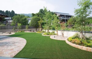#ガーデン&ウッドデッキ アプローチ空間に統一感のある敷材を採用することで、空間をより広く感じさせます。…